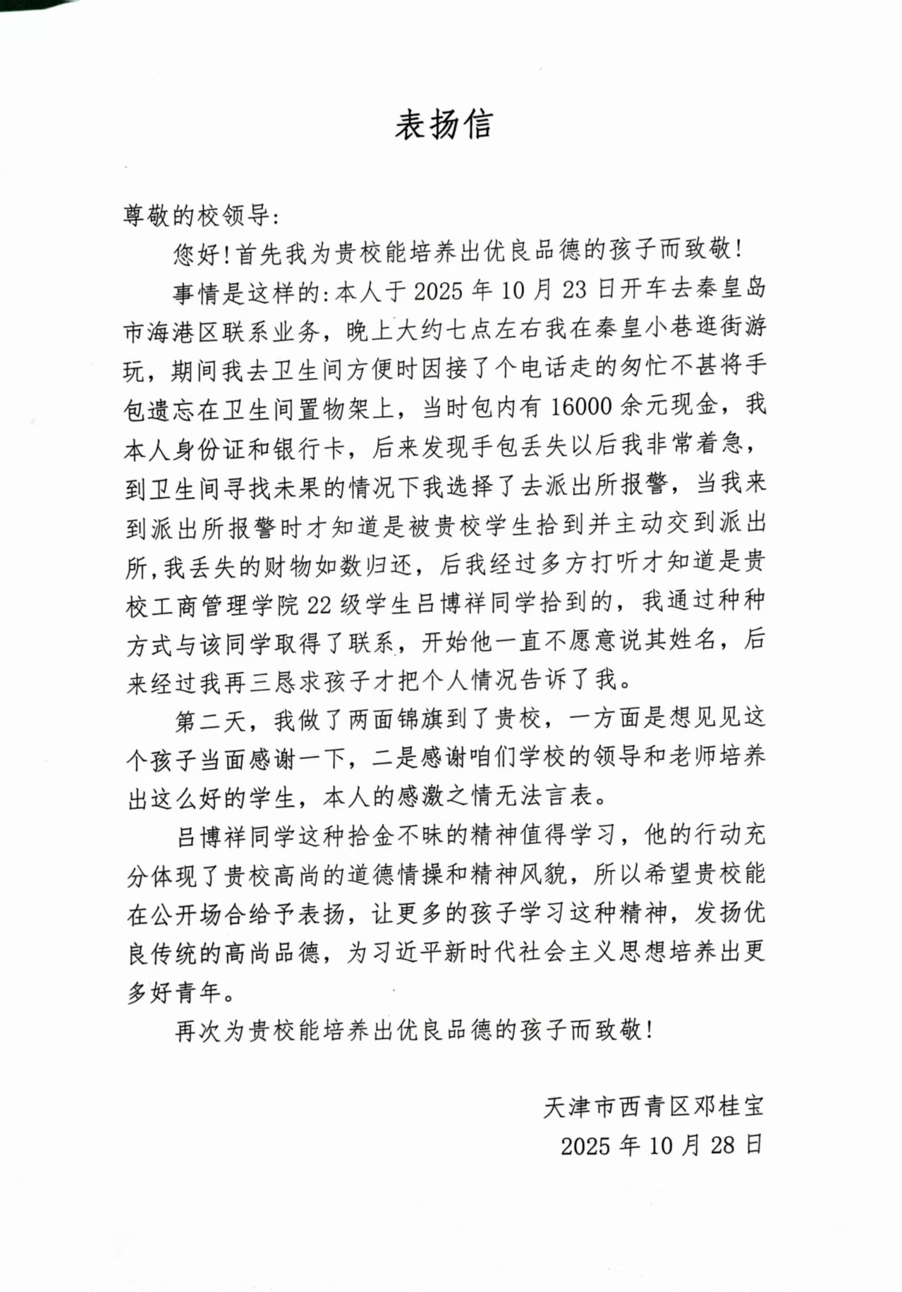 学院在全院范围内对吕博祥拾金不昧的精神予以通报表扬,希望全体学生向吕博祥学习。据了解:2025年10月23日晚上7时许,tyc7111cc太阳成集团22级旅游管理专业学生吕博祥与三名室友前往秦皇岛海港区秦皇小巷购买小吃。期间,在吕博祥前往卫生间时,在置物架上发现一个遗失的手包。打开查看发现里面有一万多元现金和多张银行卡及身份证,他当即在卫生间及周边寻找失主,寻找未果后,便第一时间带着手包前往白塔岭派出所,将手包完整交给值班民警,并详细说明捡拾时间、地点及寻找失主的过程,交代完后返回学校。