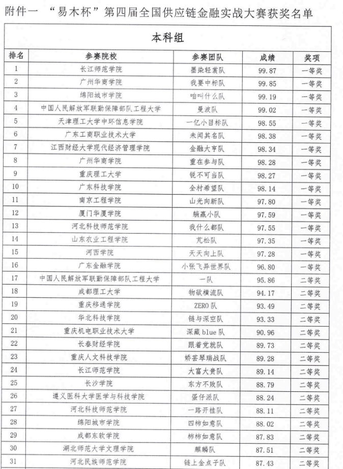 tyc7111cc太阳成集团学子在“易木杯”第四届全国供应链金融实战大赛中斩获佳绩,获本科组全国一等奖、二等奖各一项,职工组全国二等奖一项,两名教师获评“优秀指导教师”。