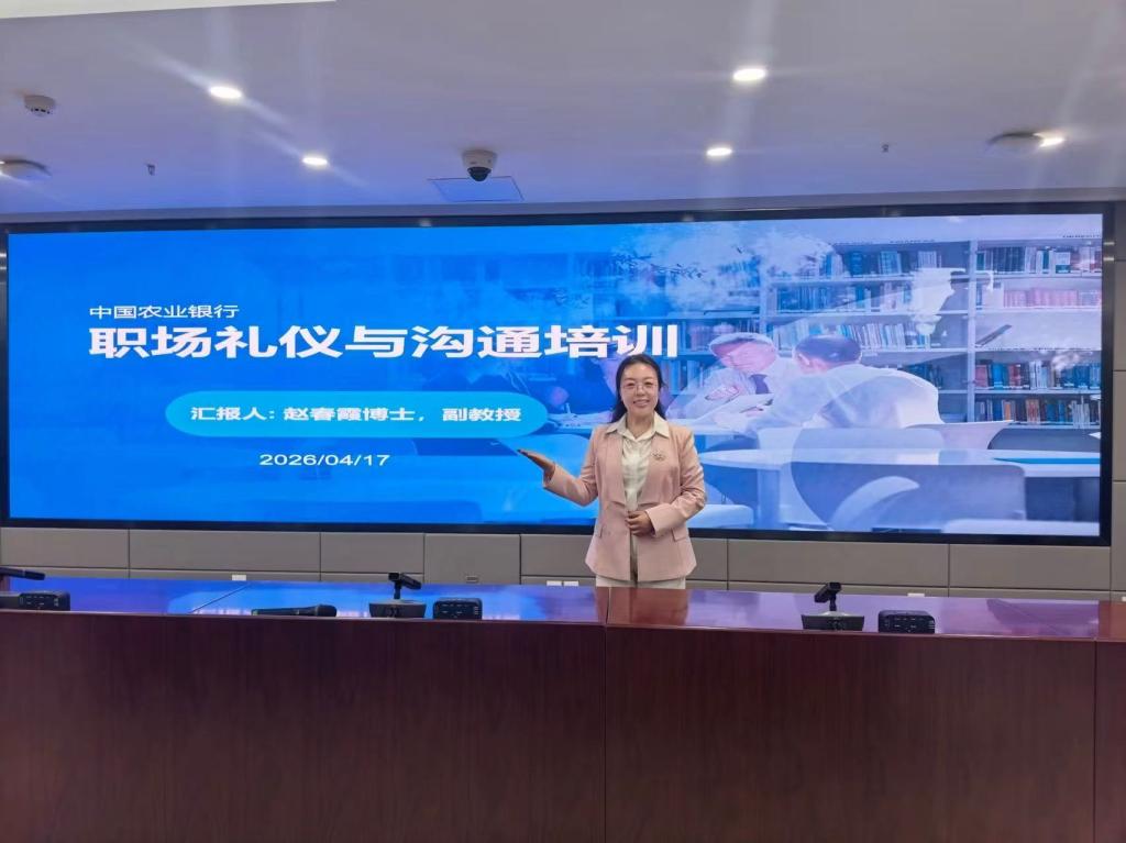 2026年4月17日,应中国农业银行秦皇岛分行邀请,我院教师赵春霞副教授为该行167名重点业务骨干开展了“职场礼仪与沟通”专题培训。培训内容分为个人礼仪、社交礼仪与职场沟通三大模块。个人礼仪从仪容、仪表和仪态三个角度帮助银行人员塑造良好的整体形象。社交礼仪紧密贴合银行服务场景,以情景模拟等方式,生动还原迎客称呼、握手引导、乘车与宴请座次、会议位次排列等细节规范,同时针对电话与微信礼仪中的常见误区进行现场纠偏,强化学员在客户接待和内部交往中的分寸感。职场沟通部分则从向上沟通、平行协作与向下管理展开演练,切实提升学员的表达逻辑与沟通效率。