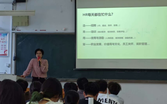918日上午,为使学生进一步增强对专业的认知,更好地契合学校及用人单位对应用型人才的需求,学院特邀张明明女士为同学们举行了以“从课本到职场”为主题的讲座。张明明女士曾在正大集团、王府井集团任职,担任过公司人力资源总监、地区人才发展总监等多个职位。本次讲座针对同学们在专业学习方法、职场发展路径以及新人阶段可能面临的挑战等方面,进行了细致且生动地阐释。